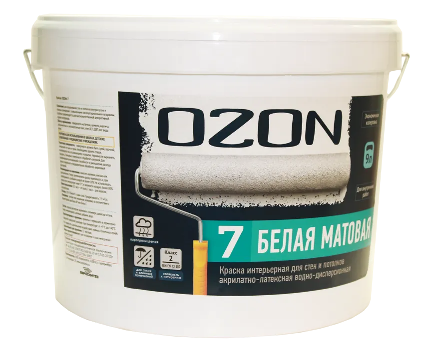 - на потолок матовая моющаяся интерьерная краска Ozon-7 ВД-АК 233А;