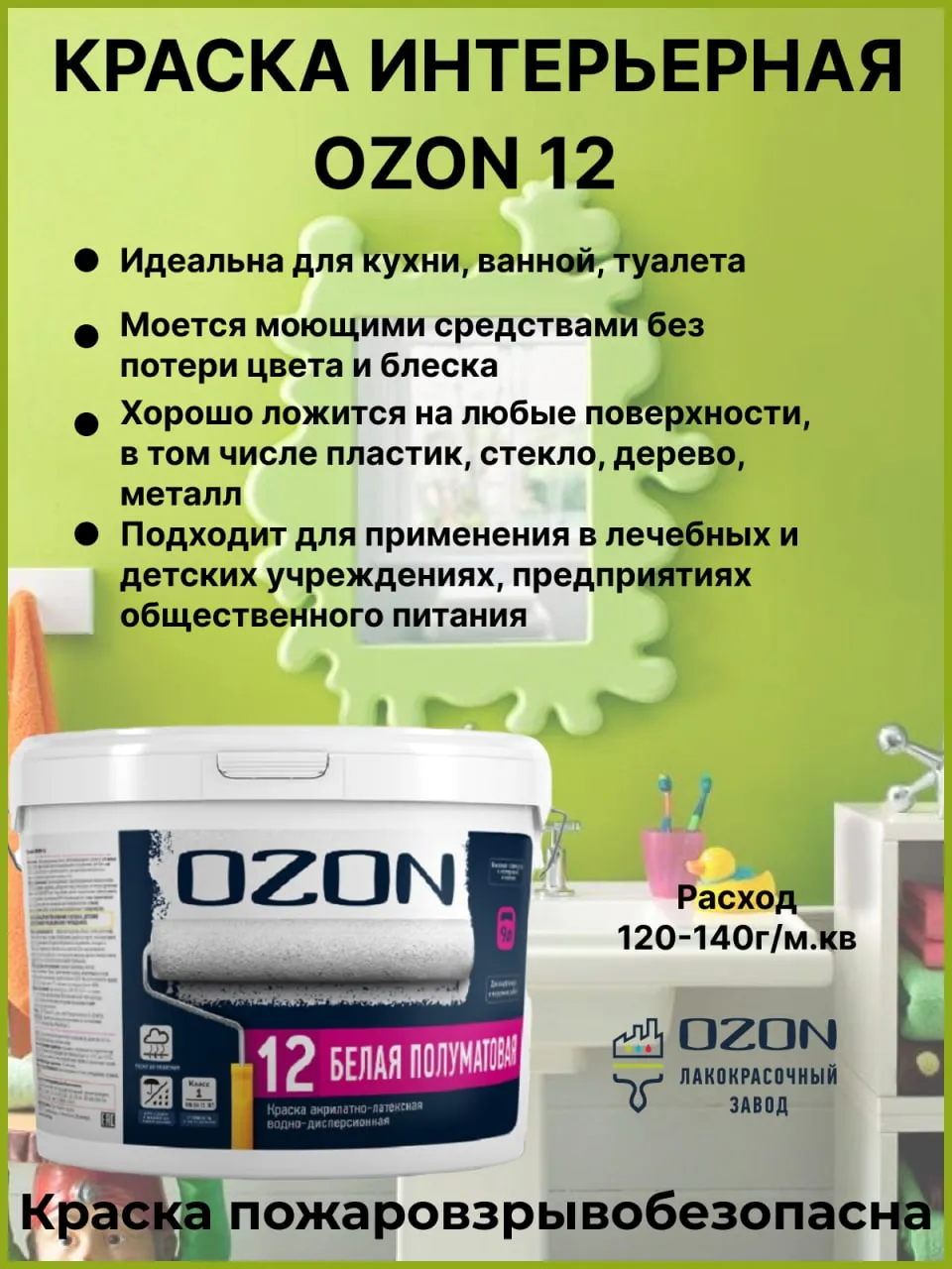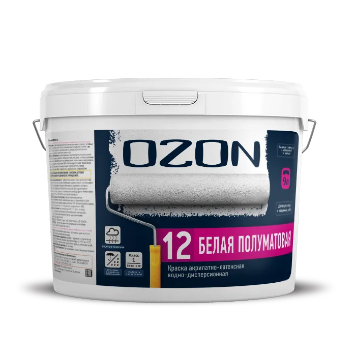 Для внутренних работ Моющаяся с применением моющих средств Краска Озон-12 ВД-АК 152 в цветах S1500N, S3560Y80R и S7500N.