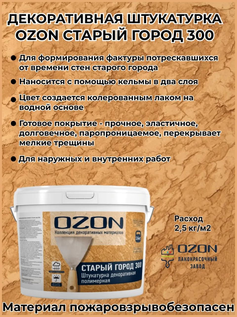 Готовый к применению экологически чистый и паропроницаемый отделочный материал для выполнения декоративной отделки поверхностей с объемной фактурой, имитирующей потрескавшиеся от времени стены старого города. Штукатурка образует прочное и долговечное покрытие, способное перекрывать мелкие трещины, и эффективно применяется для изысканной отделки стен с различной эксплуатационной нагрузкой. |